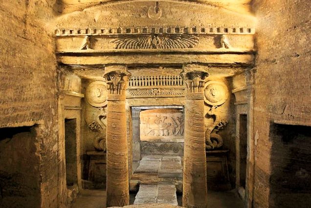 At 7:00 am, your Alexandrian adventure commences with a prompt hotel pickup. A comfortable 2.5-hour highway journey will transport you to your first destination: the fascinating catacombs of Kom El Shoqafa. This unique site unveils a captivating blend of Pharaonic funerary traditions intertwined with Hellenistic and early Imperial Roman influences. As you descend the circular staircase into the bedrock tombs, dating back to the 2nd century AD during the reign of the Antonine emperors, you'll witness the intriguing fusion of cultures.